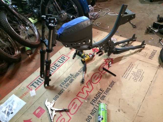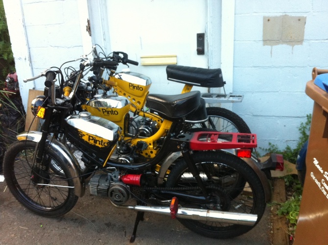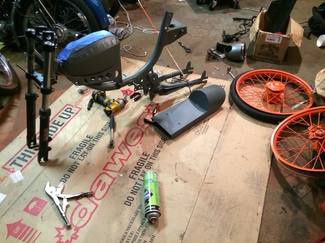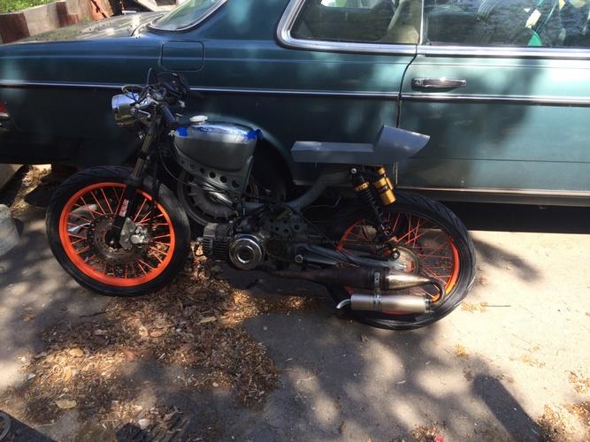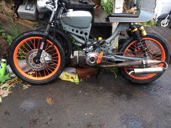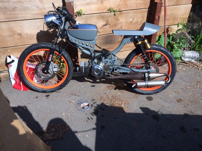 rims off a dirtbike custom disc brake mount magnum swing arm, 13.5" rear shocks.hydro shocks all around, custom estoril pipe gp1 tires still in progress willl keep my fellow pedders updated............still in progress