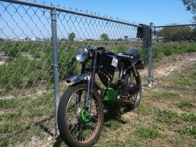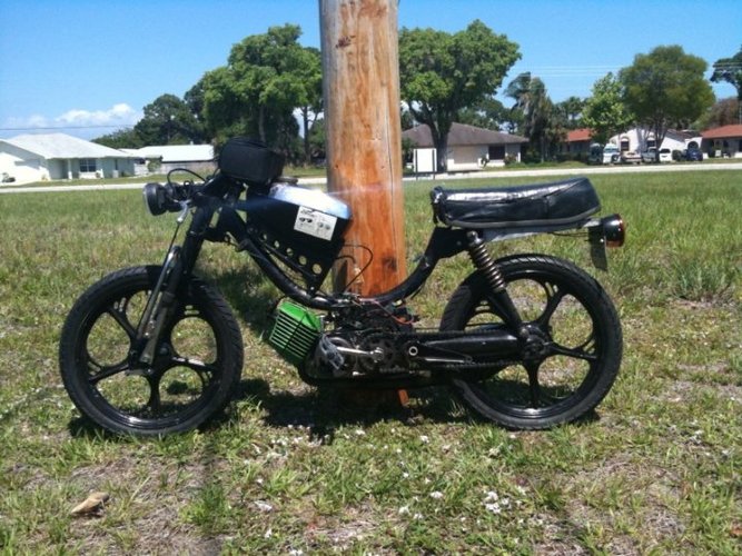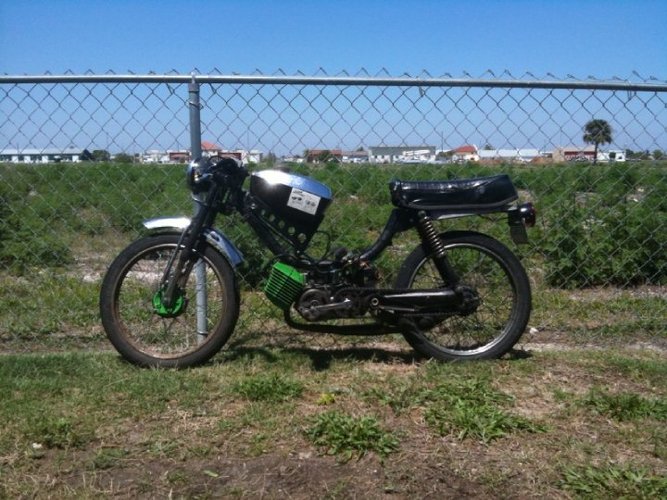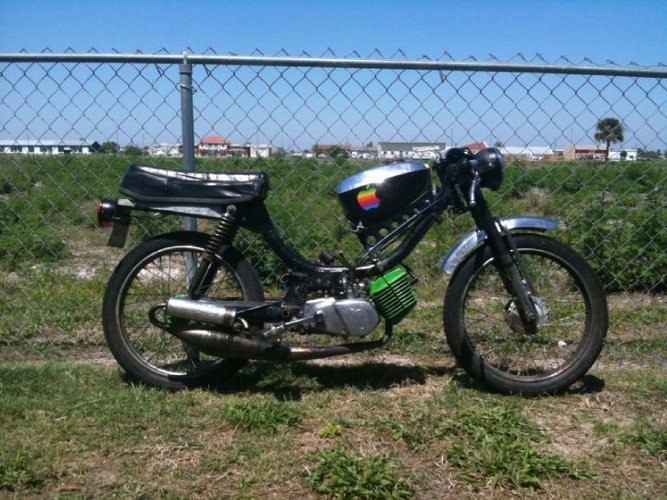 1978 puch pinto with a tomos a35. frame cut to fit the motor(it was a dumb idea and caused so many issues. Don't do it.) Later it got a alukit and mags. bike ripped solid 45-50mph. Overfilled the on transmission fluid shifted around 20-23 with 28/22 gearing. Later the bike was shift so hard that it started to bend the puch maxi style swing arms.