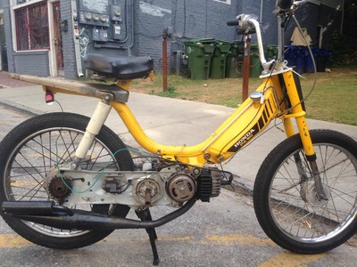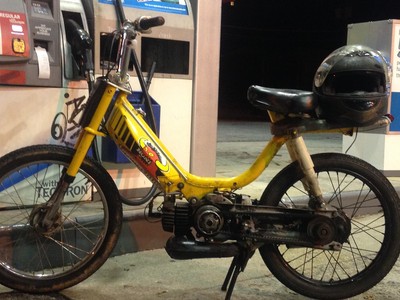 I built the salt & poppers hobbit (http://garage.1977mopeds.com/build/Salt+and+Poppers) for a friend, and traded it for his non running seca 550. Meanwhile I'd parted out and sold the frame off of the organic farmers market racer to another guy. He built it back out, and couldnt get it running, and I wound up fixing the seca 550 and trading it for that hobbit BACK plus some money. It's the frame from the old one, but that's it. whole new motor, swingarm bars n controls, etc etc; whole way thru redone. and done cheap n shitty. Jet's dilled out to 1mm, roughly a 100. still lil lean. notched pa2 var with pa1 wts. 52mph is the best so far and it fucking rips there. brakes do not match the motor nearly well enough! motor's probably going to another bike and getting the 77 cheap 70 kit w/ malossi circuit pipe in its place.