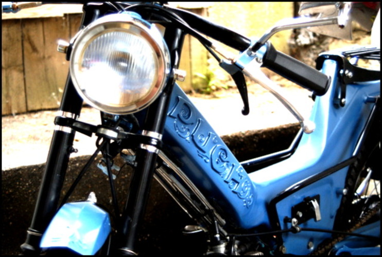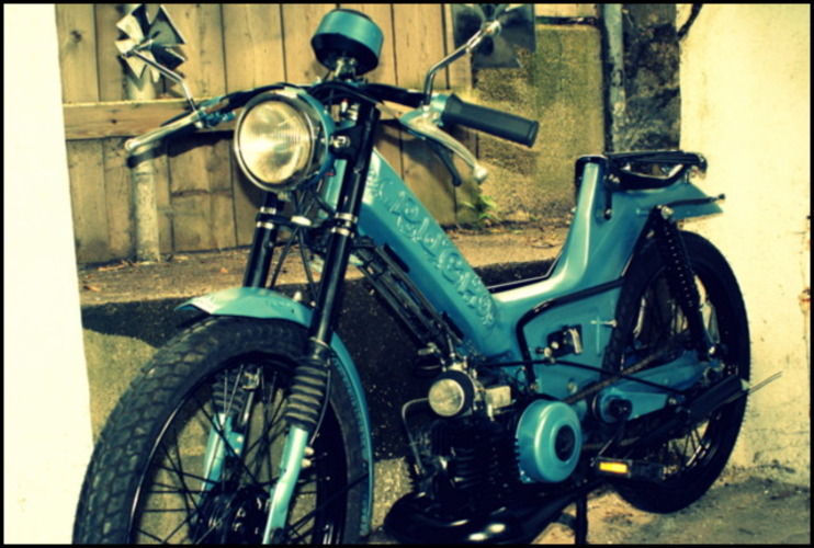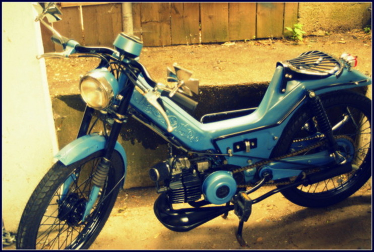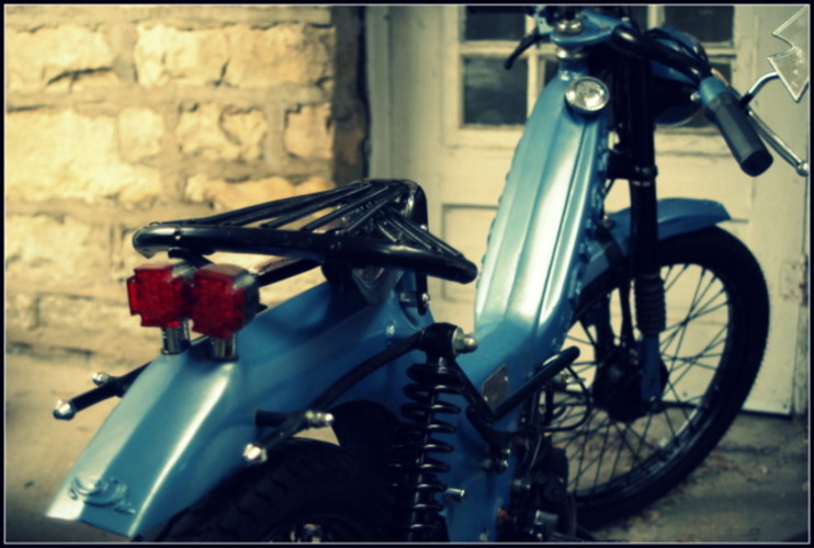 First build completed in 2010. Experimented with making the logo 3d, cut the fenders a bit, spring seat, blue led accent lights, custom cable guide, custom choke lever on right side of frame, nuke switch for leds, cut tabs, filled in welds and tank fin, etc... It doesn't do 100mph. Built to look decent and keep up with Chicago traffic. Sort of a low rider meets moped thing.