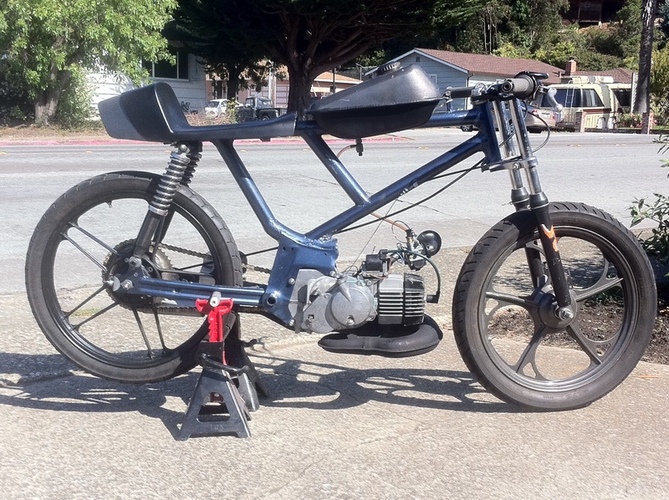 Polini motor ported to the gills with 1977 4 pedal race reed setup and custom intake. Heavily modified internals gears cut to reduce weight.