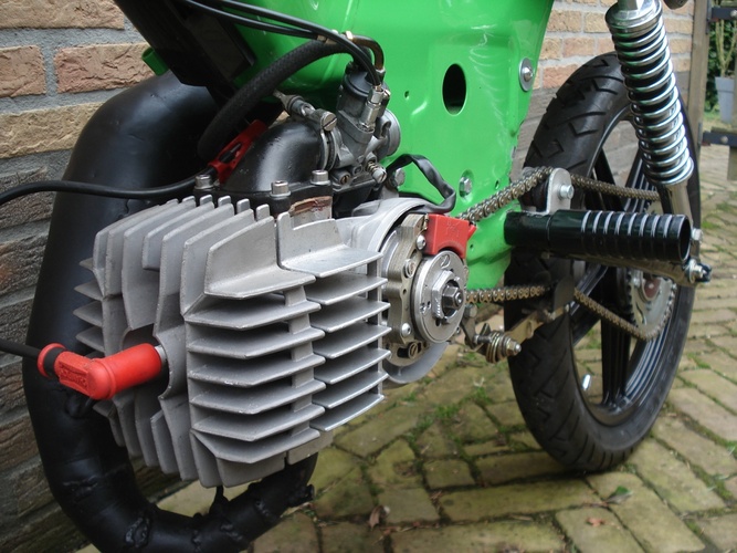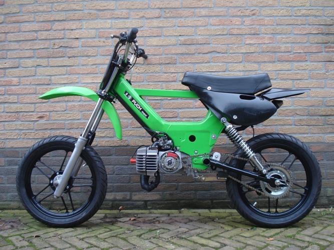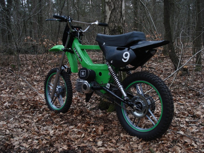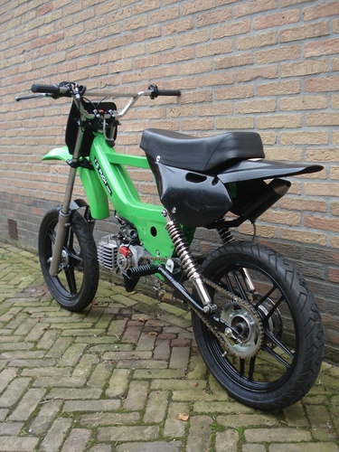 Built for hitting the forest and the street! The fork is from a Honda MTX, the swingarm is from een Honda MT5. The fenders etc are from a kawasaki kx65. On the rear side I built a disc brake. To make an upswept exhaust I took a Yasuni c16 and adapted it. Well I can tell more about it but just have look!