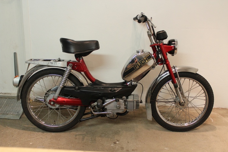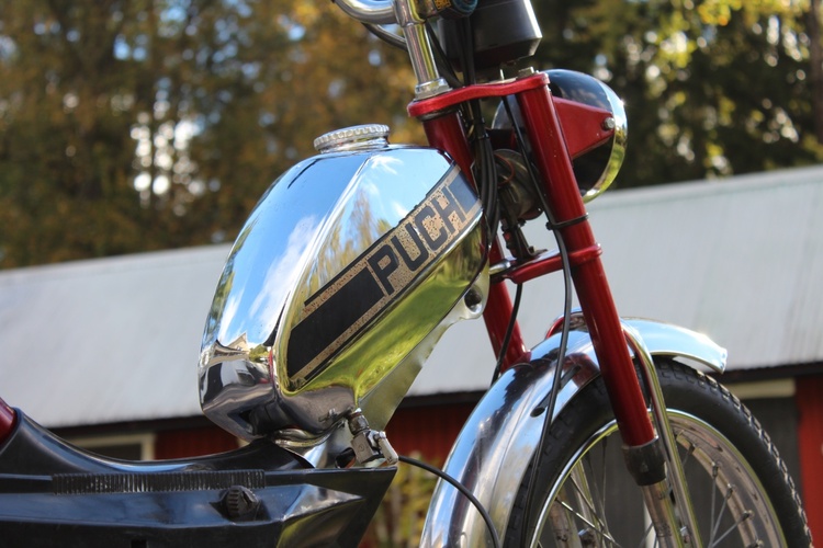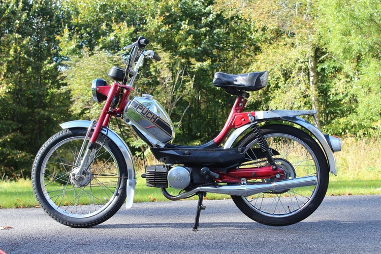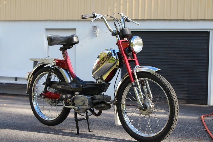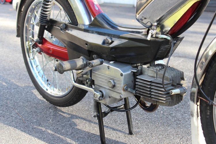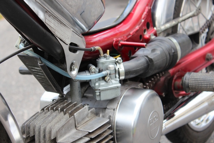 This is a Puch X-30 with the 2-speed Z50 engine. Drilled and tapped automizer to fit Dellorto jets. High comp head. Overbored carb and intake to 14mm. Top speed 31 mph.