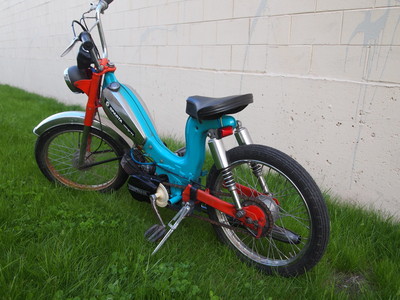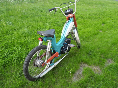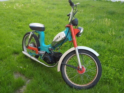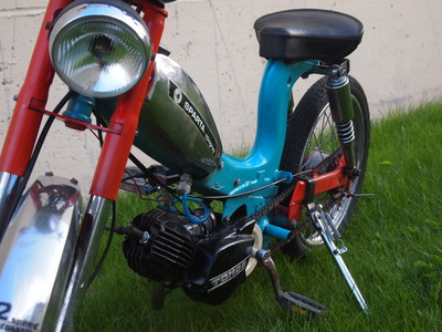 Sparta Stingray (Stingray is not an option in the model selections here) frame with the engine mounts re-welded to accept a Puch motor. Lucky for me the A3 bolts right up. Moved the seat, custom tail light, Sachs dash with speedo and kill switch, swapped the headlight and a pile of other changes. I have a set of Tomos mags I'm going to swap out so I can fix the gearing to something reasonable.