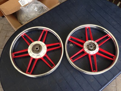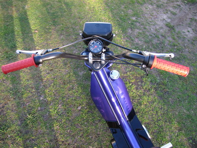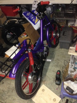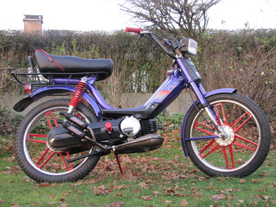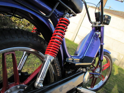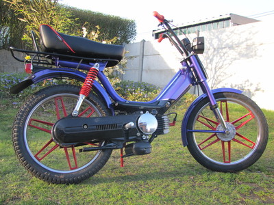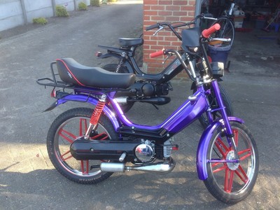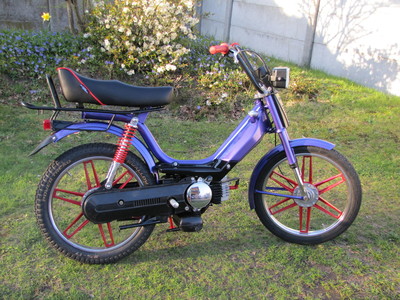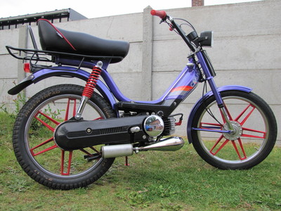 I started from collected parts, spay painted everything myself (just like I did in 1987) and the chrome on the Rigida 6 spoke wheels is still very good looking. The inner fork have been re-chromed, bought myself a new Camel-seat (blue) which I have re-covered in black with red accents. The stock pipe has been changed to a stainless steel Proma like sold bij 1977 mopeds. The muffler is what is left of my own Proma Attack, I bought in 1987. Only thing still due are the custom made stickers and connecting the lights. I love this one, this one has been buil by me from scratch.
