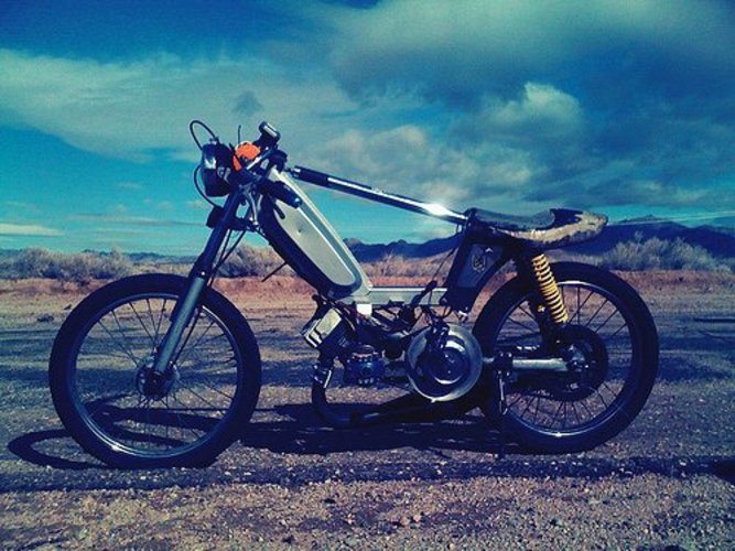 Currently lives in a box until a custom tube frame is built. Plans to make lightest possible frame for wheelie machine. Pug 103 with all the race trimmings. Doppler blah blah, Mvt Blah blah, gas shock belt tensioner.