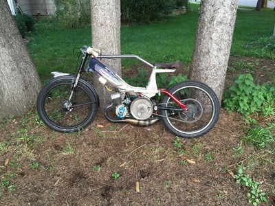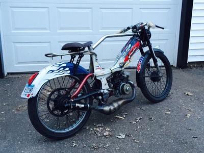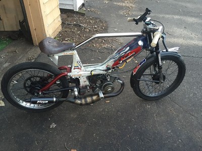 Garage leftovers from other builds. Bought the bike super cheap with 4 coats of different spray paint on it from previous owner and in ugly completely stock, ugly, and not running condition. Sweet flames though! ha. Scraped some paint off so it looked even crappier, hacked the frame up then worked on the AV7 - raised exhaust, lowered intake, and widened/matched transfers. Le partie CDI, 15 SHA Carb, Ninja G2 Pipe, re-used the hard tail from a prior build (buddy made it so it bolts/unbolts! out of BMX forks), Seat off an old 80s? girls Huffy bike. Hobbit forks, ER3 variator, Rips off the line- faster than a stock hobbit with a proma from stop sign to stop sign tops out around 38mph. Need to downjet, lighten the spring/change it, and add a launch lever.