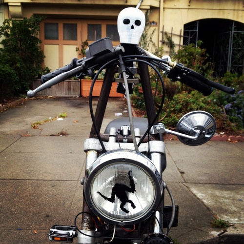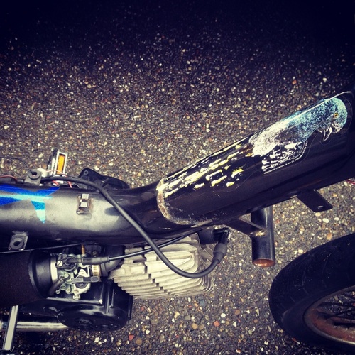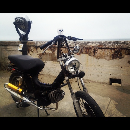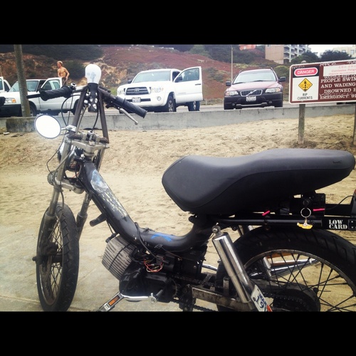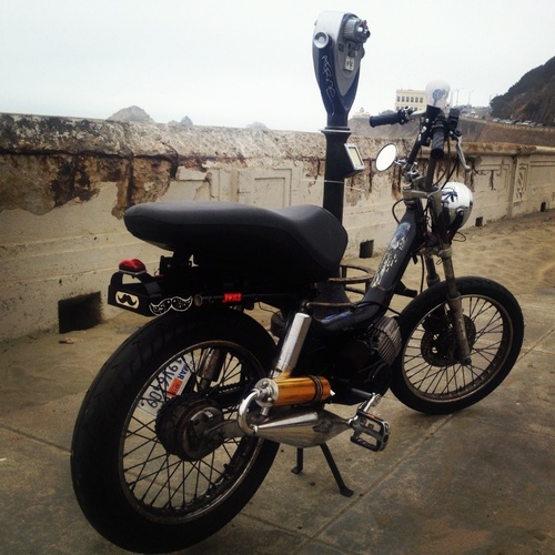 This was purchased from a rad librarian who rode it everywhere and brought it with her to SF all the way from Florida. I removed all of the plastic, replaced the kick start with a pedal start a55 and Blitz pipe and carb. The bars were welded by Terry Dean Cain. The Yellow Submarine keychain was Michelle's (the awesome librarian who sold it to me). Special "rainbow spinner" halloween skull light between the bars. Sticker of pigeon pooping on the tank/frame by Antihero Skateboards.