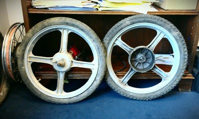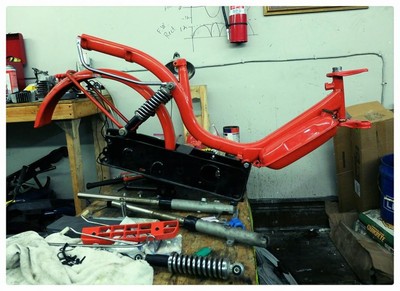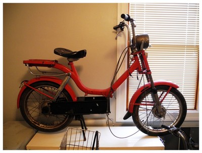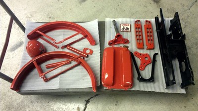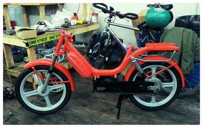 This project started out as a trashed, incomplete Vespa Bravo. Disassembled and powdercoated to match as close as possible the original paint scheme. Painted four star wheels on Sava MC2s + Kriedler shocks + Rebuilt rear transmission with larger brake pad. Motor will be a stock Euro kickstart CDI motor, a single speed transmission, and a Simonini proline pipe. Probably will upgrade to a 10-pin 64cc DR kit in the future. Still trying to figure out the seat and bars situation.