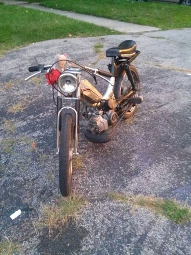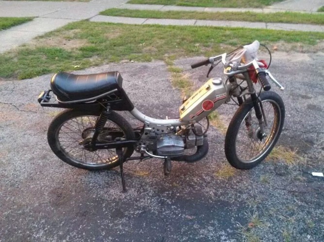 It was time to switch my pinto up, so here it is, lowered and dropped the seat back, added a motron tank and ditched the trashed fenders. Added a Treats reed kit with Malosi 4-petal reed block upgrade, 21x35 gear ratio with flipped clutch, this bike really pulls on the low end and can still get into the high end of the 40's, also its ugly so yay mopeds!