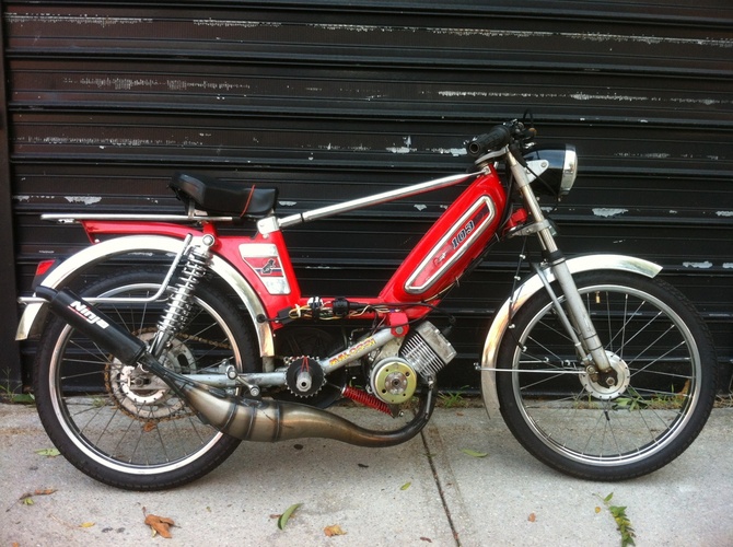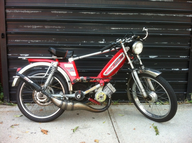 Stock cases that I cut in the 3rd transfer and polished, Gilardoni 70cc kit, Malossi hi comp head (no decomp), Polini 2 pedal reed block and intake, Doppler pipe, Dellorto 21 PHBG AD race carb, and Malossi E12 fliter