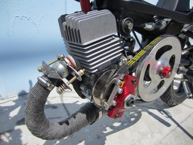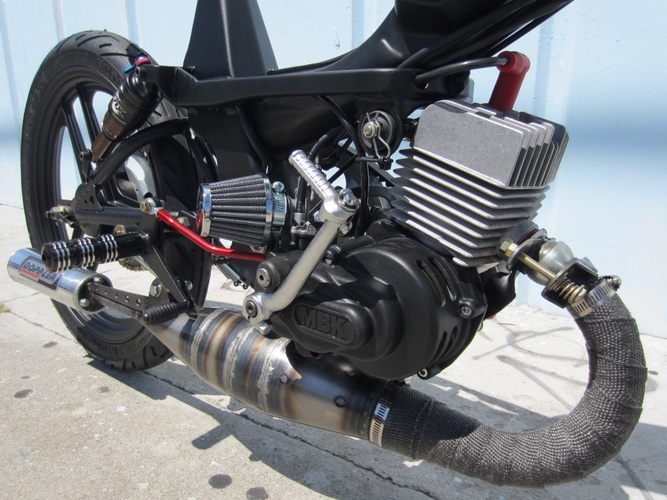 Stock av1o cases, doppler crank, doppler 50cc cylinder, doppler head, doppler stock 2 petal reed valve, dell orto 19mm carb, doppler exhaust modified, stock mbk cdi, mbk kick start, doppler er3 variator, doppler pulley, malossi belt, stock engine spring, custom launch lever.
