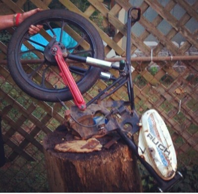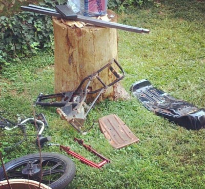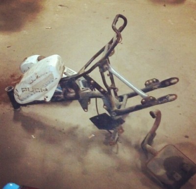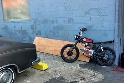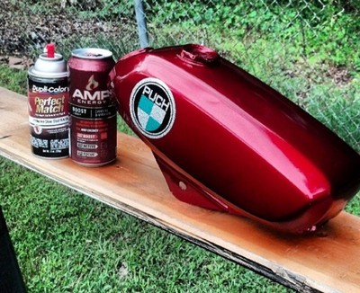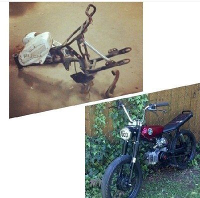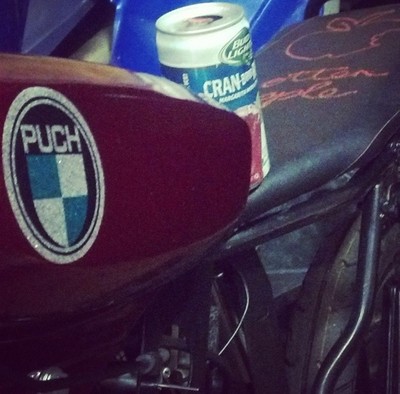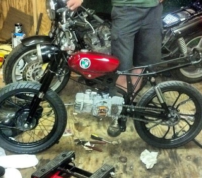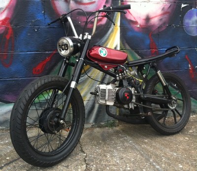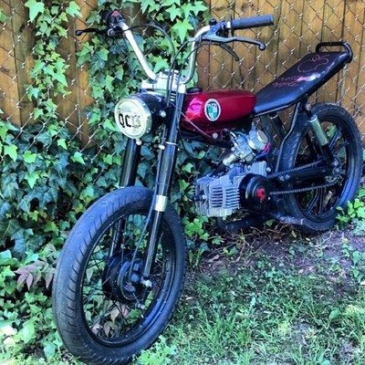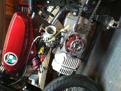Bike started as a frame that was sitting on a shelf at my friends shop. I cleaned up the tank RedKoted the inside and painted the tank a candy metallic red. Forks are k10 with a Kinetic front wheel. Handel bars and controls are also off a Kinetic. The rear swing arm is a modified Tomos Targa swing arm. The motor is a e50 with lightened main gear and clutch bell. It has a 2 shoe clutch with kick start springs. The kit is a heavily ported K-Star with port mapping to match a Polini kit. I extended the seating area and made a seat pan. My friends wife did the stitching on the seat. Ran stock points for about 2 years and they just went out. So I poped on a mini rotor.