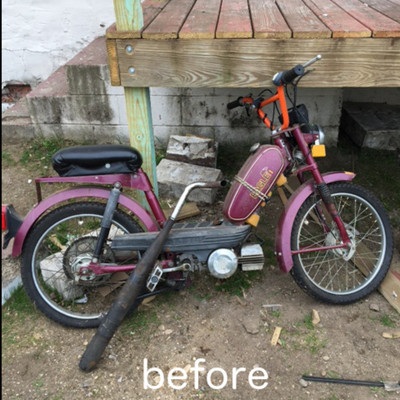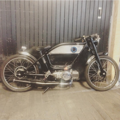Sachs "Fyling Eagle" Bobber / Boardtracker - Started w/ Sachs Eagle roller and 505-1d engine. Handmade 16g steel gas tank with porthole sight glasses. Highly modified frame w/ extended hardtail rear end, all welds moulded with body filler for a seamless look. Suspension seat made from rear shock. Dellorto SHA 15 w/ intake riser. Sachs 28mm header w/ Jam expansion chamber. Sitting on a set of Gazelle 17" tires.