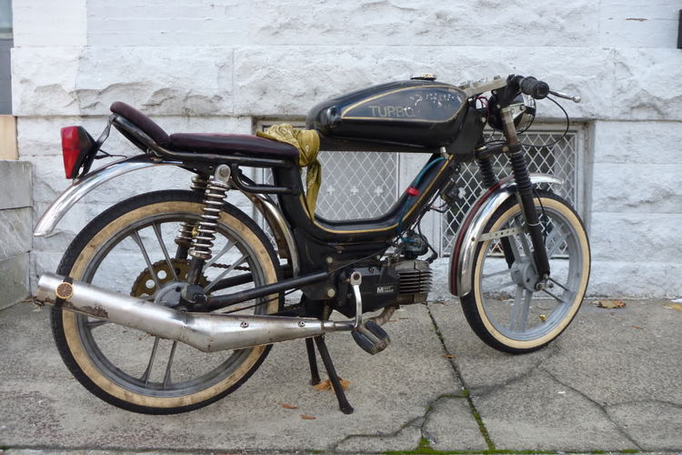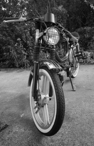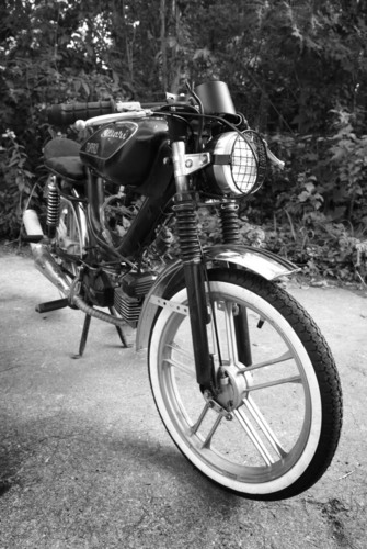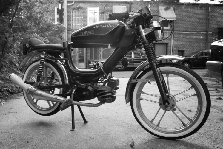 This was one of my first bikes that I really wanted that almost un-rideable cafe stance on. its been kept mostly stock on the engine side of things. I chopped off the seat post and built a seat onto the rack with a piece of shelf and an old shirt and some packing foam. and made the clip-ons a-la the original Nate Bandit thread with bike stems and a set of flat bars.