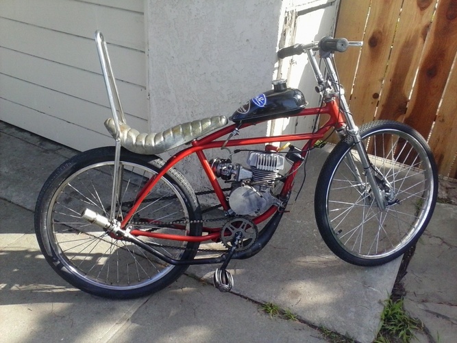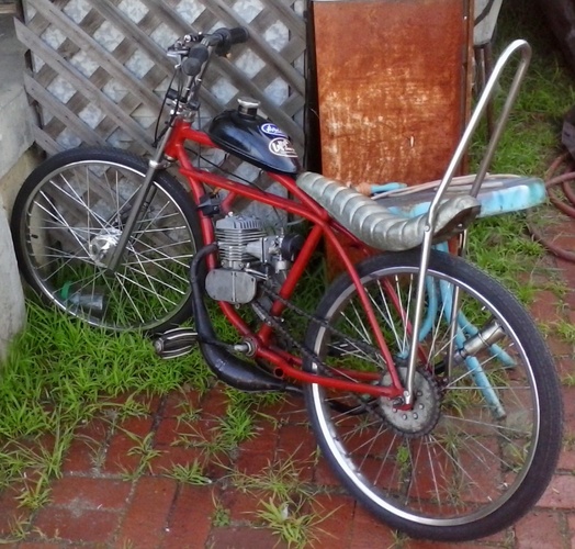 Old Schwinn Straight bar frame motored bike with "hated 2 stroke motor" with some moped stuff on it. Just a fun budget build to cruise around town and race at the track. Puch O-ring head, Arrow Motorized bike reed kit, Clone-Carb?...