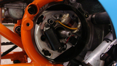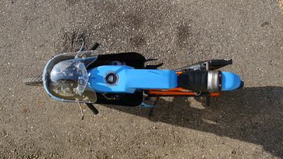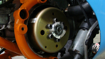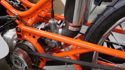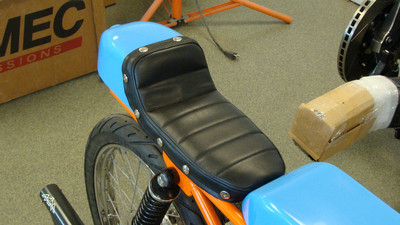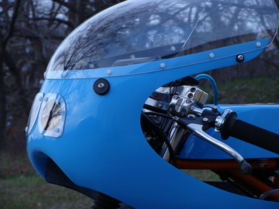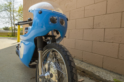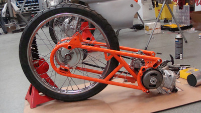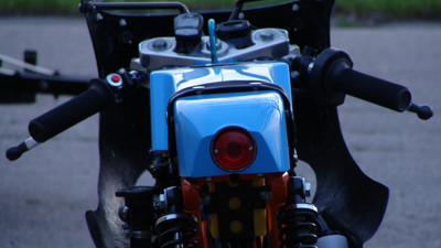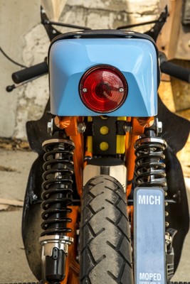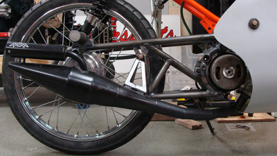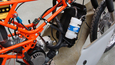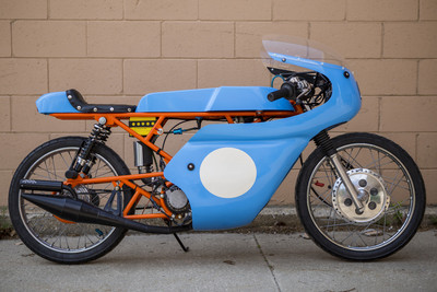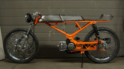 I wanted a vintage 50cc racing bike but didn't want to pay for an original or try to source rare vintage parts. the base bike was a 78 pa50I that in the end, I used the engine cases and gearbox. The frame and subframe are 3/4" chromoly steel, fork tubes are a yamaha pw80, and front brake off a kawasaki kz400. The radiator is from a ninja 250 and running a bosch pump. Frame and subframe are powdercoated in a "safety orange" and the bodywork is a urethane base/clear in grabber blue.