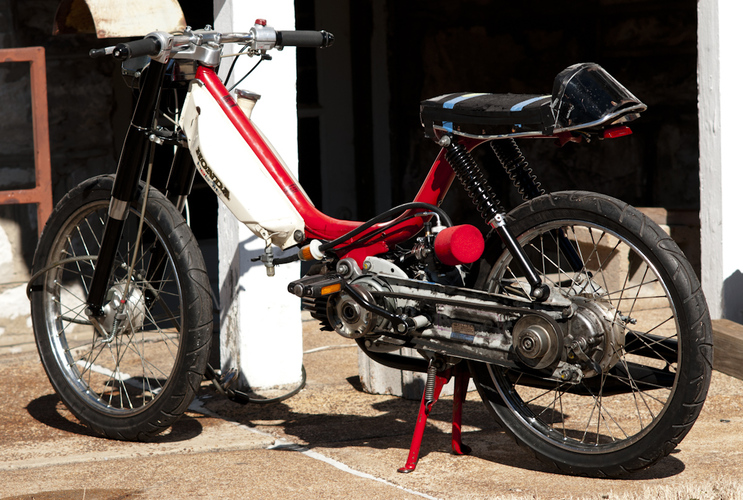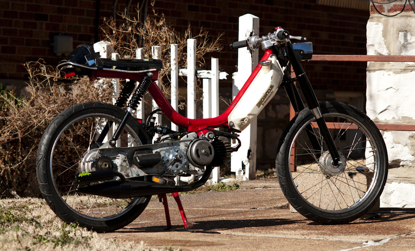 Pa50-I that has had the motor mount moved back 3 inches and forks swapped for Suzuki k10 hydraulic forks. Front variator is a TJT and the rear has a second spring in it for more progressive actuation. The intake is custom made and is 21mm. Has the blackpipes pullstart. Top speed gps'd at 59.2 mph.