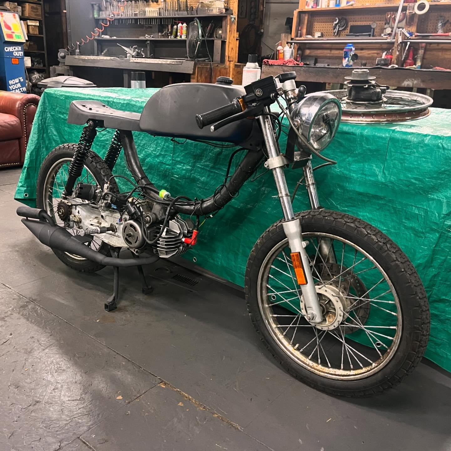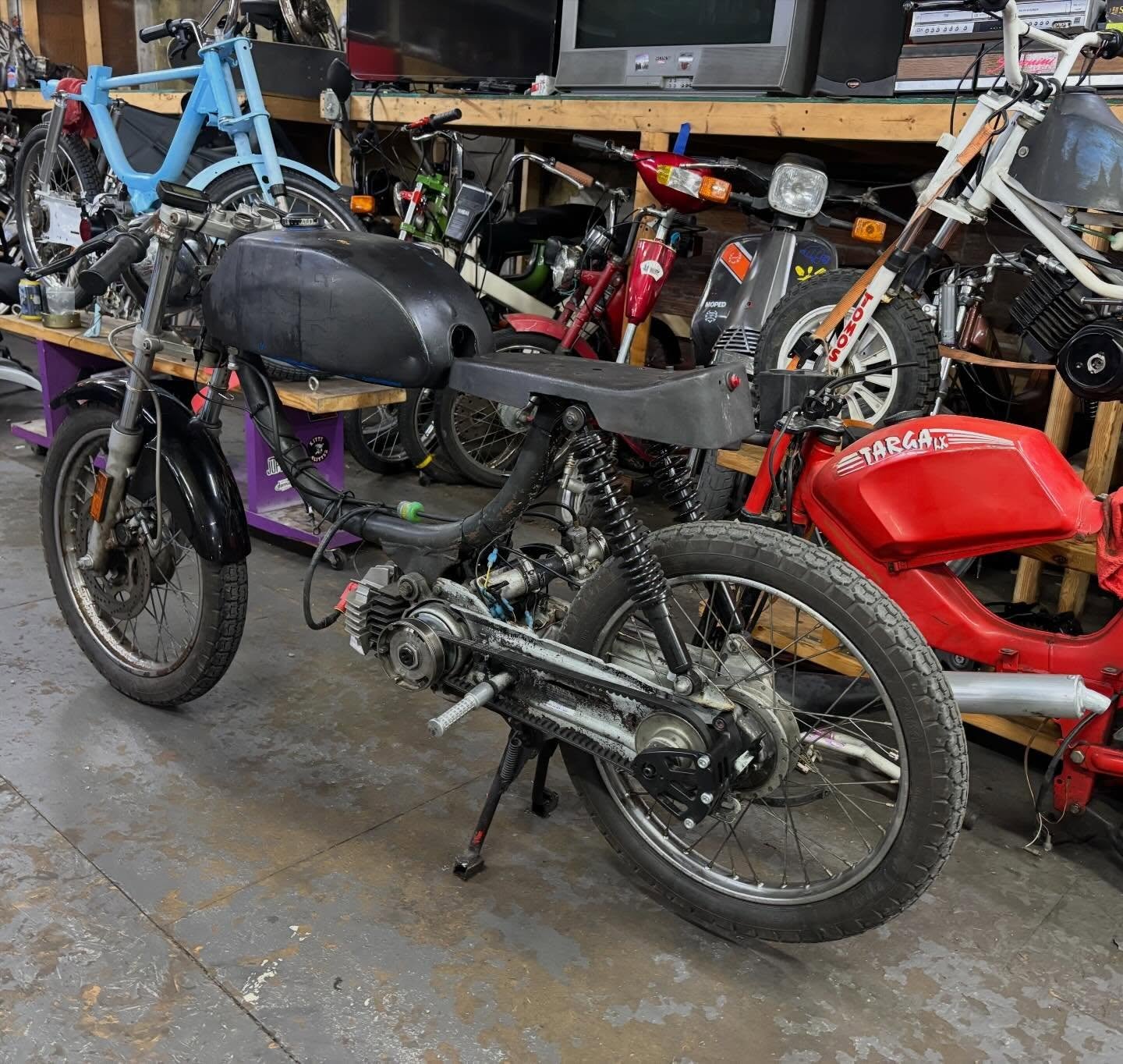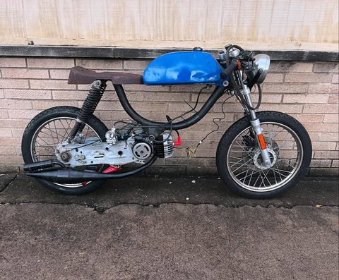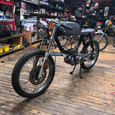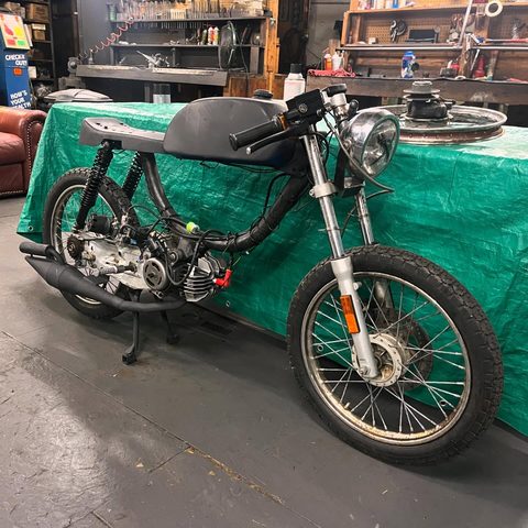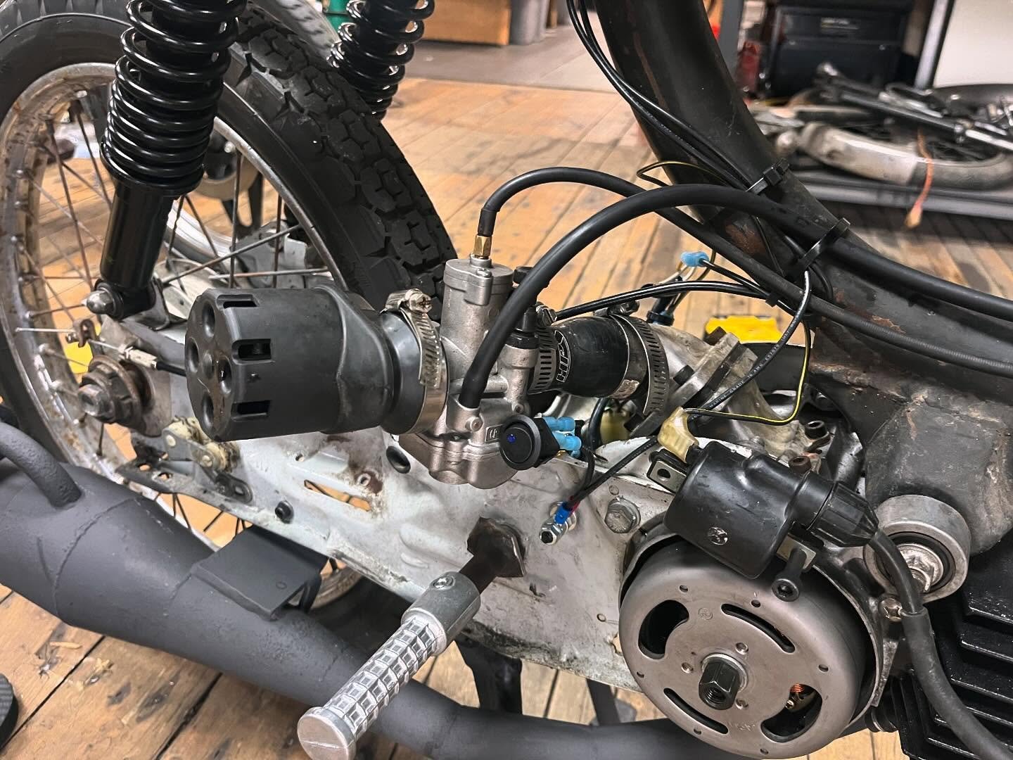 For the motor I rebuilt the bottom end with a Treats Stuffy crank, DR kit with some exhaust port work, pa50-2 bell with starter arms removed & a one-way-bearing, Treats Dio reed spacer with 6-petal reedblock, I used a cheap dio intake for OKO's up to like 30mm? I used a reducer to bring it down to PHBG/CP spigot size, added a 21mm Polini CP, MlM BK100 pipe, Derbi head with no dcomp, TjT with 12g weights, Polini clutch springs, a stock CDI, Treats belt 4-U, US contra w/yellow spring, Treats contra support, and a Treats pull start.