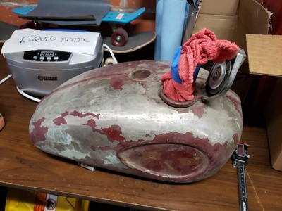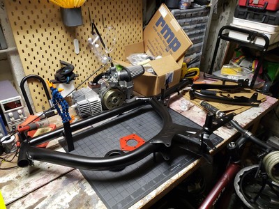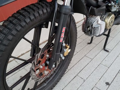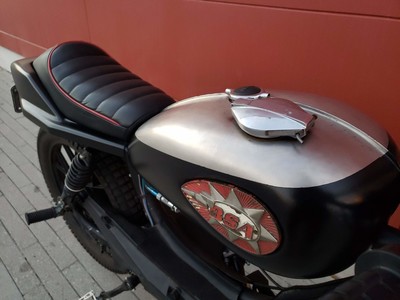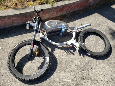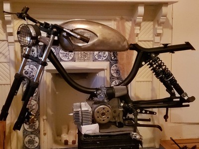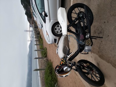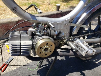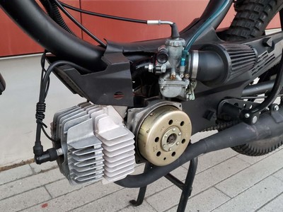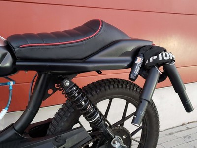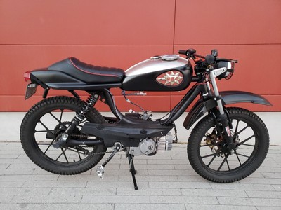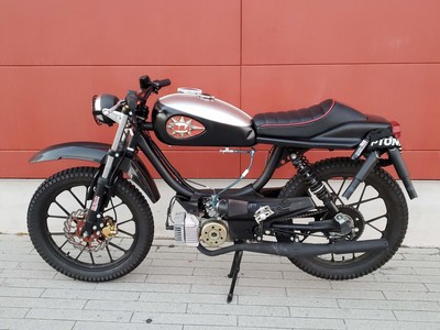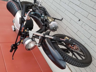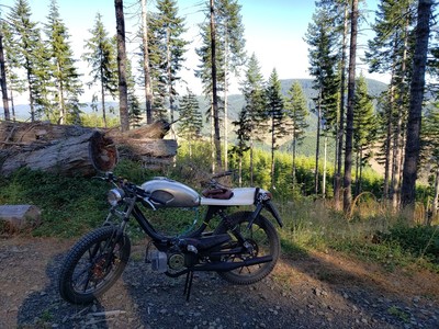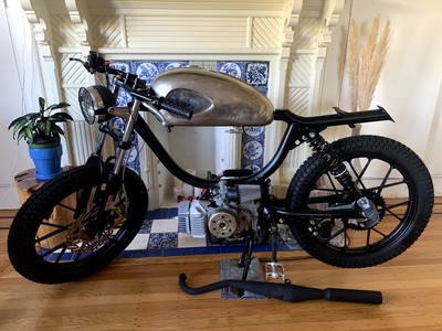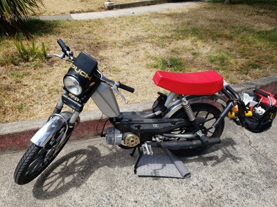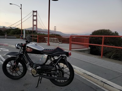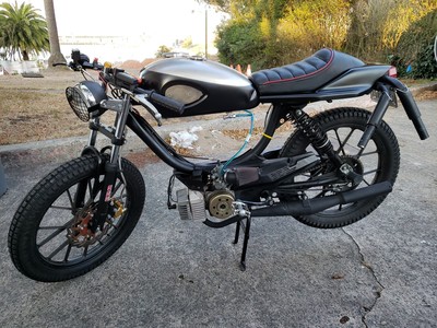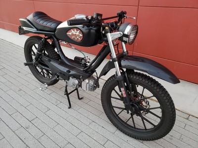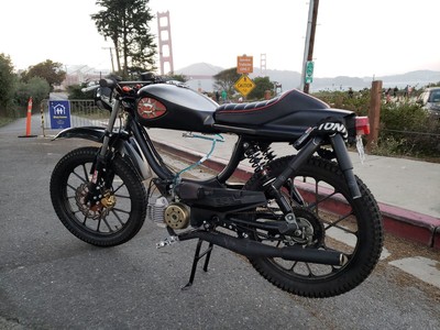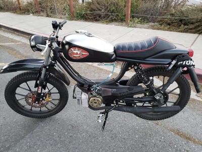 1978 Puch Free Spirit given the top tank scrambler treatment. Mostly things I found on Craigslist in SF. Custom seat and rear fiberglass fairing BSA Lightning 1969 Fuel Tank EBR Front Fork: Maxi Size Mag Snowflakes with front disc brake Shinko 17 x 2.75 knobby moped tires 3D printed taillight mount / surf rack mount Next up is exhaust and figuring out top speed....