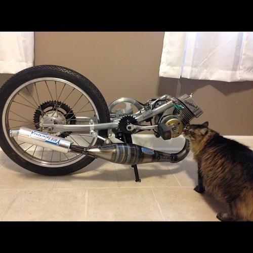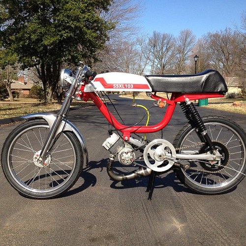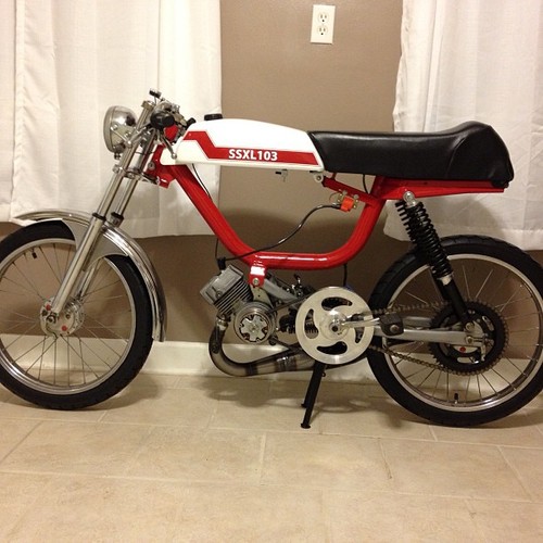 I give you, my idea of the perfect hybrid, the SSXL103, code named "Cherry Bob-omb." Two perfectly good frames were mutilated to create this masterpiece. A local rider, Joe Seidt, helped me to acquire both frames. I wanted it tall, but racey, being 6'2", mopeds aren't exactly meant for my build, so some super tall shocks and forks later, and we have perfection. seat height is about 1.5" taller than a stock magnum.