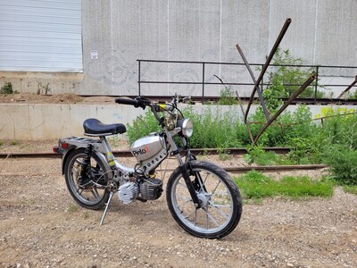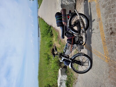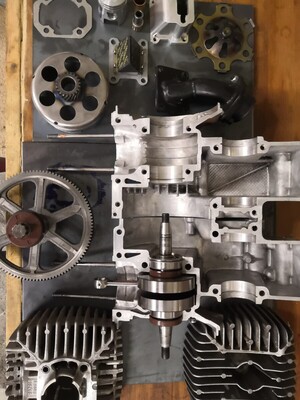Reed adaptor on intake with vforce reeds and a polini cp 15mm crub. Cranks 102mm pipe. Artek Peugeot ignition. Claw 2 shoe and Mr. Cool Ice. Lightened stock internals. Rear disc for skidz!
