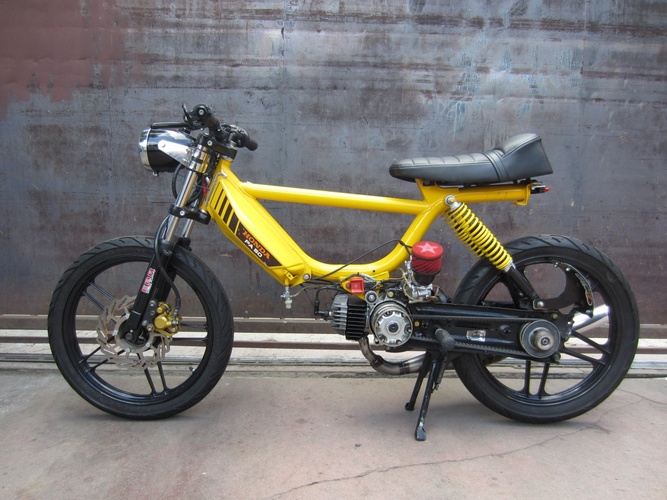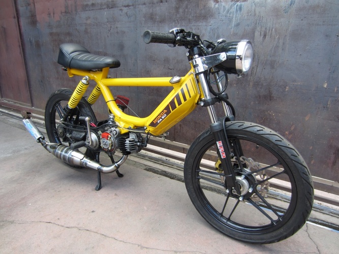 Honda Hobbit PA50 II. ENGiNE: Athena 70cc, high comp head 70cc, trickmetric reed block 6 petals, 24mm mikuni carb, hpi cdi, doppler peugeot pipe, TJT variator. CHASSIS: Stretched engine mount 3 inches, ebr fork, tomahawk fork brace, mike thomas disc brake, seat upholstery.