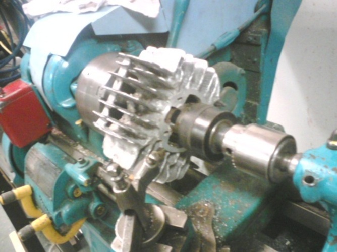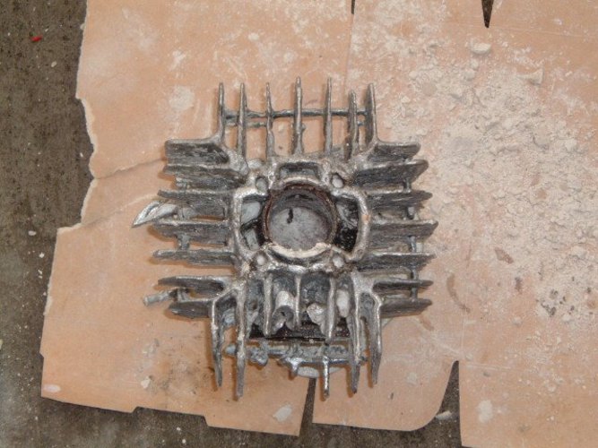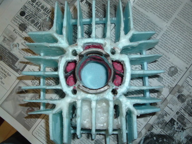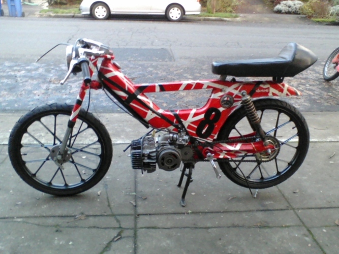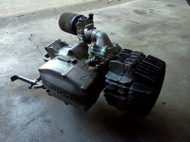 the "swamp thing" engine, featuring a (very) DIY custom cast cylinder, and case inducted VL6 reeds. It's just about finished - many custom parts, like the cylinder, the engine case, the homemade seat, homemade clear flywheel cover, flamethrower exhaust, etc.... etc....