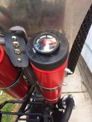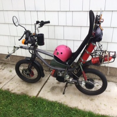 Recumbent based on QT50. Frame modified with new upper shock mount, foot pegs out front mounted on mountain bike stem, cross tube and seat mount. Many mods including front disc brake in stock hub with Wilwood caliper and custom mount. Custom made gas tanks with hockey puck gas cap. Battery, CDI, wiring stuffed in modified Walmart pencil case. 2.5" rear tire.