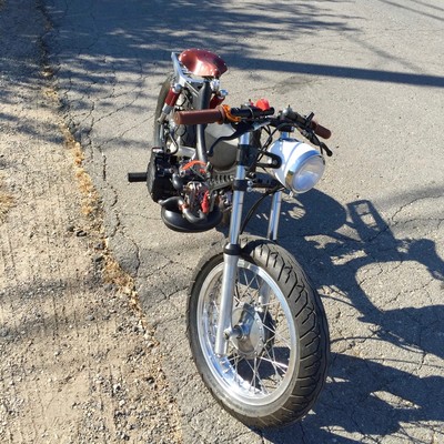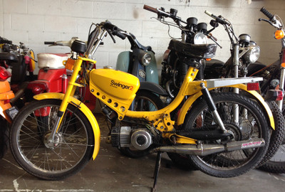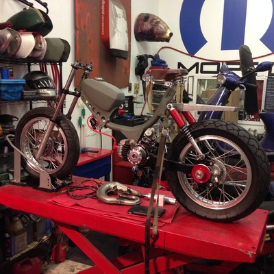 I had these rims in my shop because I got 'em so cheap--like $40 each--but since they were 16's I didn't know what I was gonna do with them. I typically build cafe racers, scramblers, etc. out of old Japanese motorcycles. Then I started sharing shop space with a moped guy; and then all these ped heads start hanging around the shop, and they're having more fun than I am, and the next thing I know I'm buying this Swinger2 with no engine, and this one girl's selling a Hobbit engine...