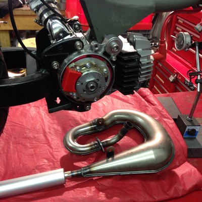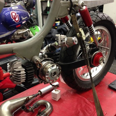 Fresh rebuild with aluminum stuffed race crank, 70cc DR cylinder and piston, Malossi H2O head. Breathes through a TrickMETRIC adapter, aftermarket reeds and Dio intake. The carb is Tillotson HL324 (about 21mm venturi, I think).