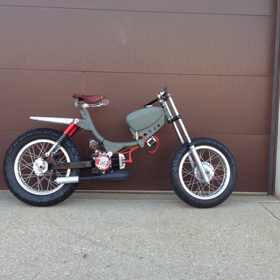 Frame and tank are from a '78 JC Penney Swinger 2. Engine's off a '81 Honda Hobbit.