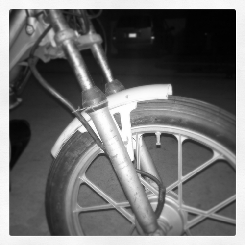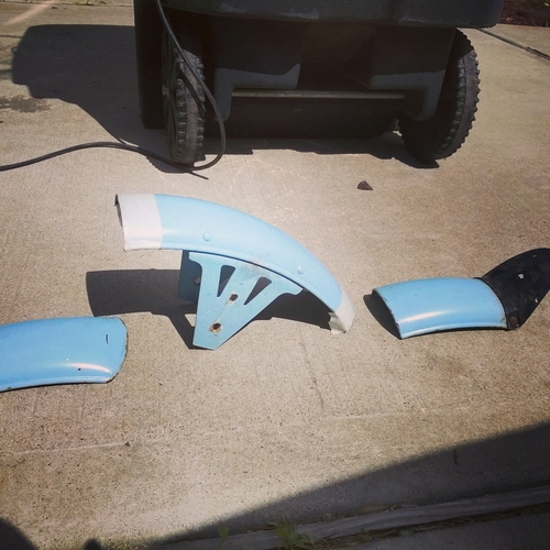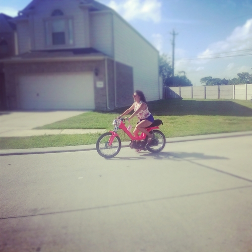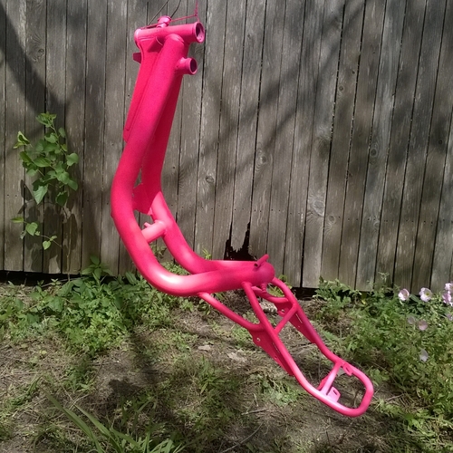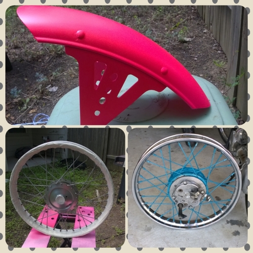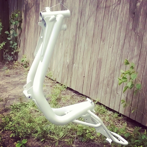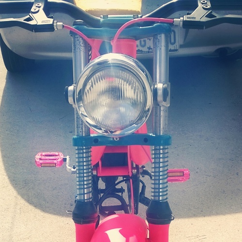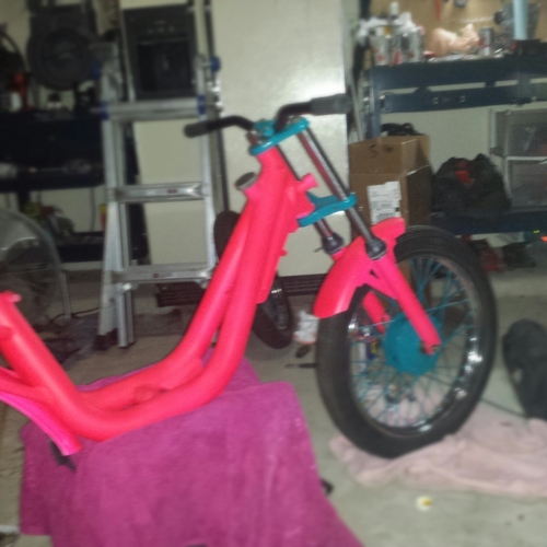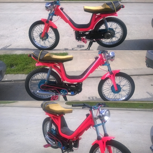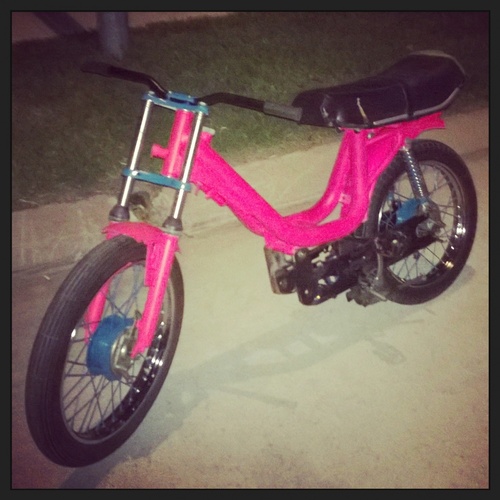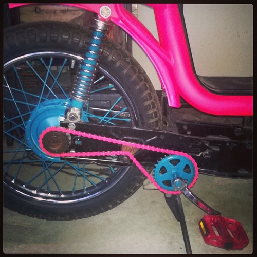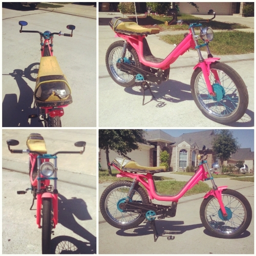 Flat pink Vespa Grande with turquoise accents. Almost complete, seat needs to be finished. Pink list: translucent pedals, brake/throttle/decomp cables, chain, frame, forks and fenders. Turquoise list: grips, fork tree, gas cap, custom fork spring/boots, spokes, and shocks. Front fenders chopped and lowered to hug the wheel more. Rear fender chopped off at the end of the seat, left on there to keep the mud/dirt from slinging up. LED tail light (will post a pic of it later). Modified kinetic subframe/swing arm. Mountain bike handlebars, and levers, chrome throttle. Took the rear springs apart and cleaned the chrome on the spring and painted the shocks. Cleaned the chrome on the rims and painted the spokes. Removed as much rust from the forks, wheel, head light, springs and muffler as much as possible. Removed all paint/dirt from aluminium parts (engine, case, and light mounts). Installed a keyed kill switch, simplified the wiring to allow for running light and headlight. Only mods are removing the brass from the variator, carb, and ordered a pipe. I will update with new pix soon, will be adding white walls or pink/turquoise walls not sure yet. Bar end mirrors have been installed, wires have been concealed and top cover has been put back on just have not had a chance to take a new picture. Follow @djlouSpin instagraham