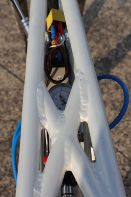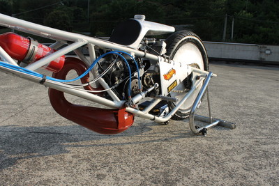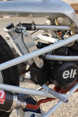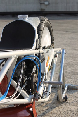 Custom alu frame, home made pneumatic shifter and a completly stock (*blink) not at all tuned (*blink *blink) 50cc engine...