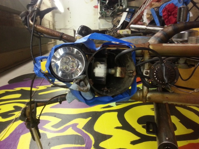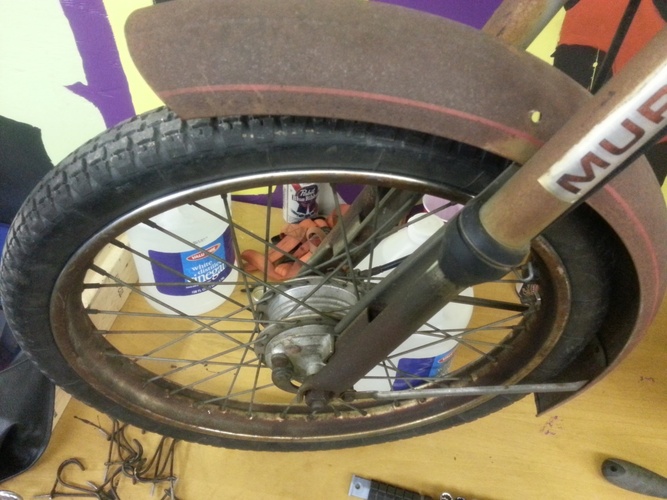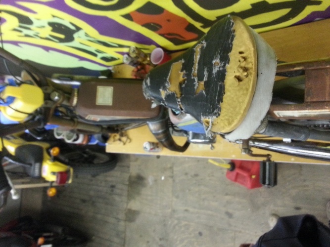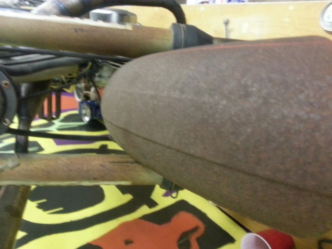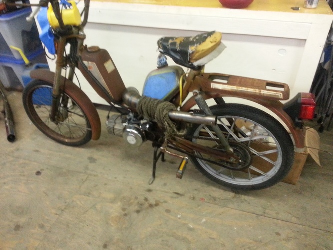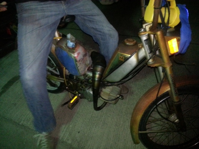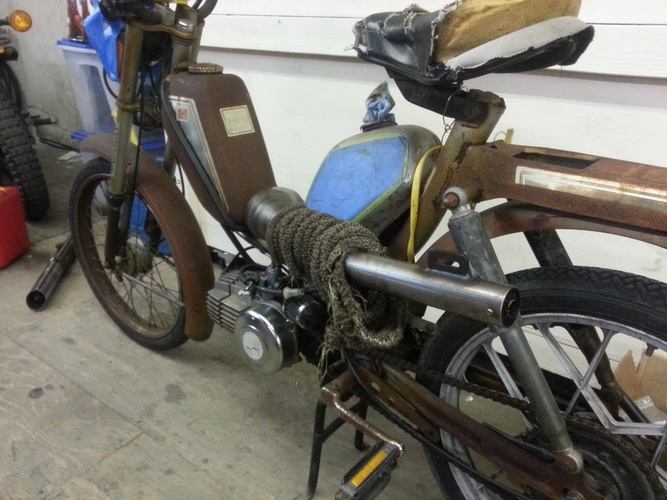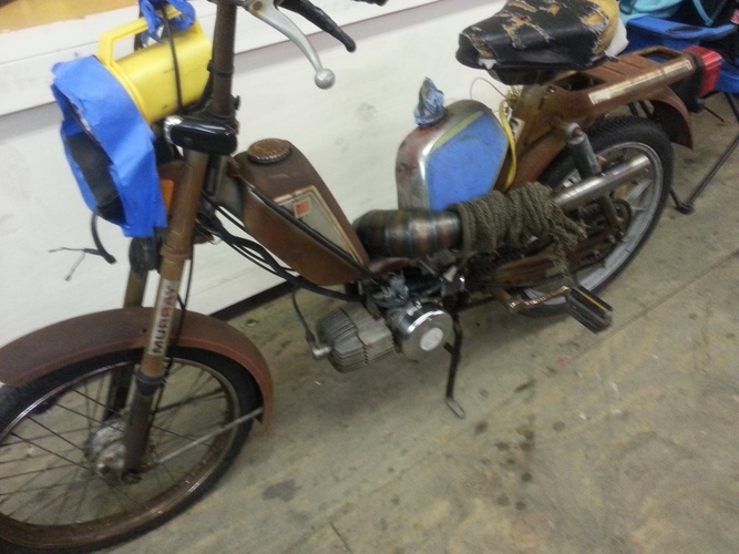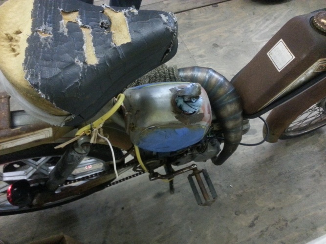 Tetanus a.k.a. "$80 discarded in a field, offered to me by a passer-by while on group ride, purchased within hours for frame only, told it ran few years ago (yeah right), miraculousy found to turn over AND spark; B tank necessary bc - believe it or not- inside of tank is worse than outside, against all odds starts on 1/4 kick...idles and blasts at 35 completely stock and 40+ mph gps w rusty mlm prototype pipe, now my favorite curb hopping bike...coming to a rally near you in 2013." aka "Brad Pitt Blaster" aka "u will need to sign a waiver first" aka "Defy all known Rules of the Universe" aka "lots o butthurt when this turd passes your kitted bike"