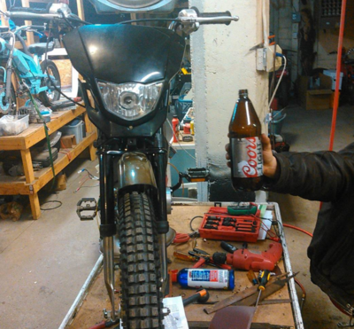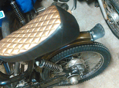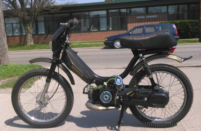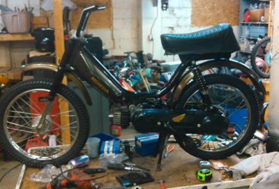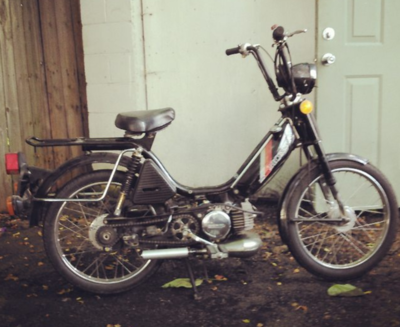 I got this bike from Simon Early also of the Ghost Riders, he found it in a barn out in the sticks for dirt cheap. Started life as the super rad 1983 Hobbit that came with a CDI on it stock and dorky turn signals. Oddly enough, it had an Aero 50 CDI box on it so when I had it modstock with a pipe this bike was torquey as hell. Stripped it down to the motor and powder coated the frame in our shop. Initially, the gold flake powder that you see was a total accident but I said fuck it and ran with a #BlkAndGld paint scheme. Front fender is the stock one I chopped down and mounted to the triple tree. The headlight I found on ebay from a Chinese parts distributor, thing looks like it was made for this bike. Mud flap on the rear fender came from a trashed Fantic V1 we had in the shop. Seat was done by Ghost Rider Craig Hobbes as an early birthday gift. Still in break in, but hitting around 48. Once I feel that the kit is relatively well broken in, I'm going to down jet and see if I can't at least get 50+ MPH out of this build. At some point, I'd like to also have someone custom fab an upsweeping pipe to really get the Enduro look on the bike. It's dangerous to have the circuit on there with the offroading I've done on this build thus far.