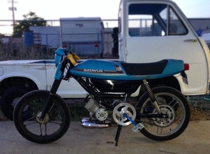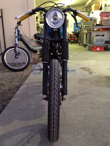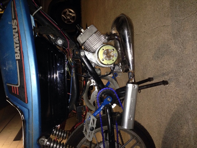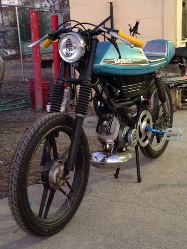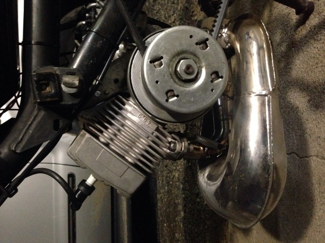 The motor is actually a Ramzey Peugeot 103 clone motor, the kit is untouched, motobecane CDI because the stock ramzey CDI fried. Finally got a seat for her! Swapping out the wheels for KTM foxi deluxe mags soon and working on fenders.