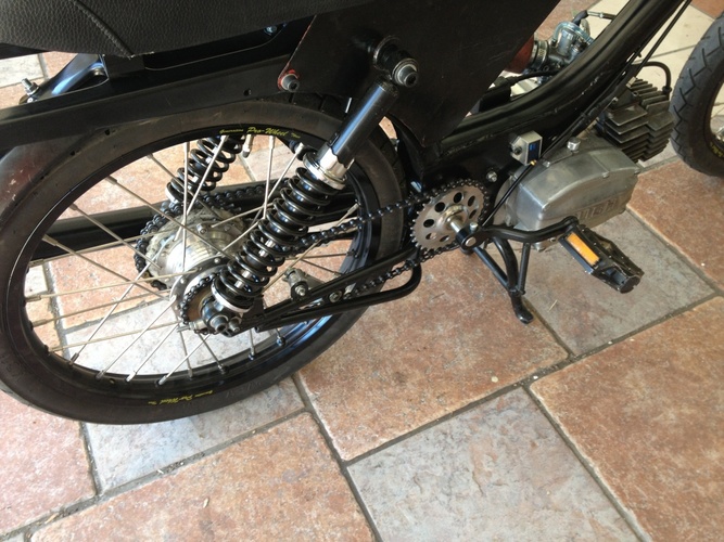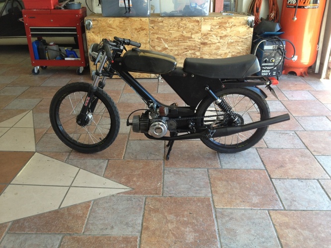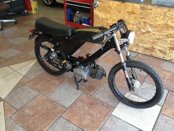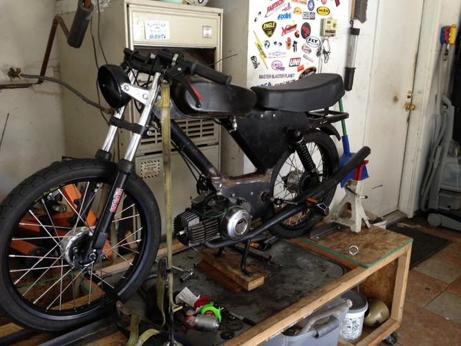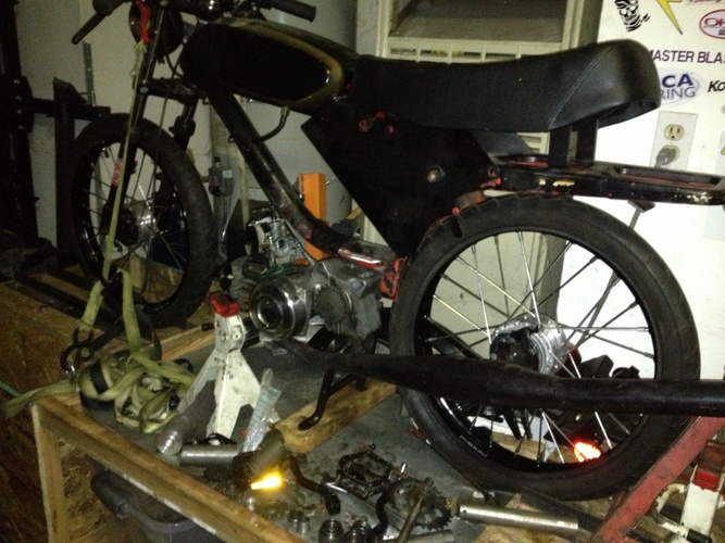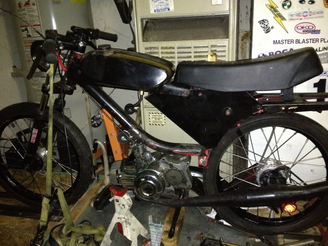So our buddy Bret bought this piece of crap on Craigslist sight unseen... Flew out from KC to SF, built it in a field with a box of parts he brought with him (Pug?). Rode it dubs for our Sacto rally. Rode it back to SF, chained in up in front of a bar. Alan retrieved it, mailed back some parts and stashed the bike... Gave it to me for a song and I frankenbiked it with some stuff I had around for another build. It's super sketchy, too damn small for me and a ton of fun.