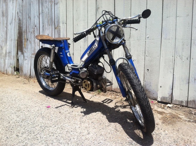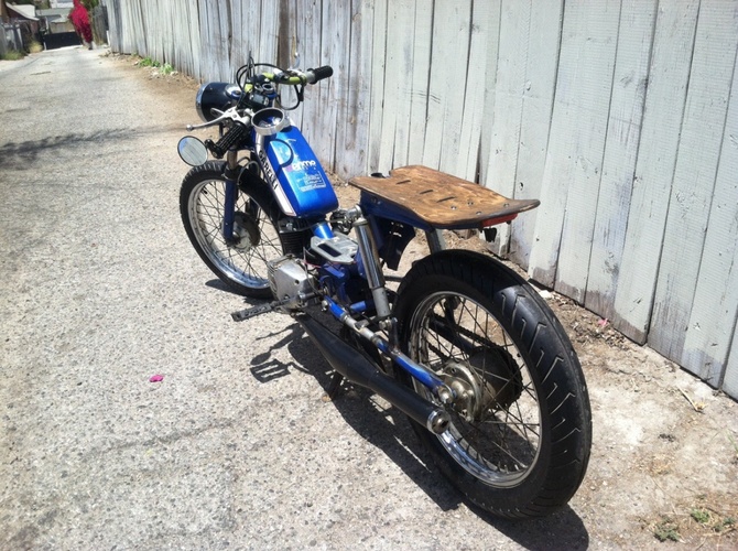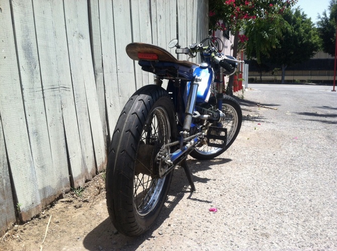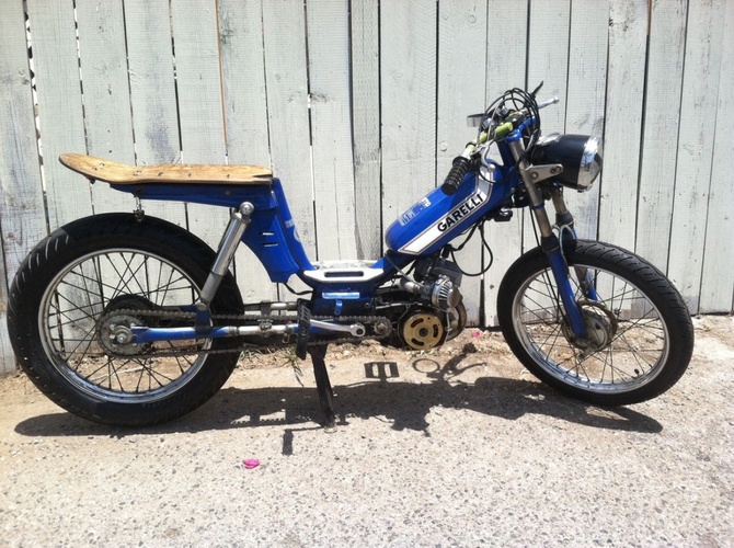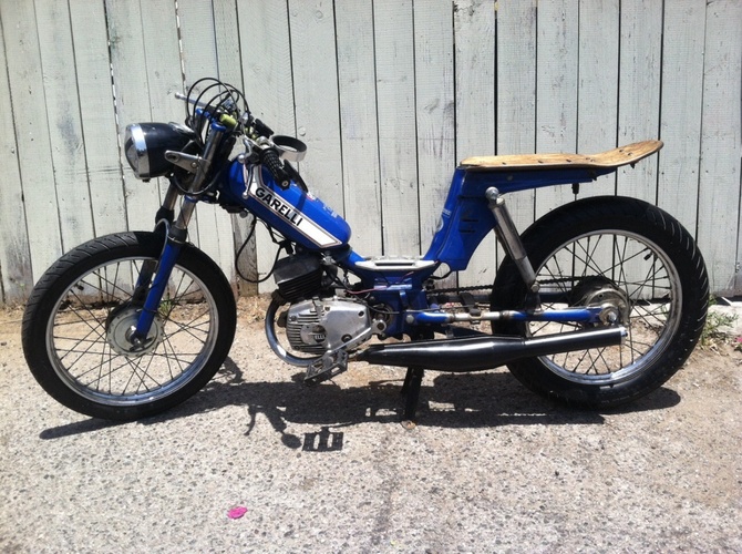 I bought this bike off cg and completely gutted and tore apart the engine, clutch, tranny and electrical. Decarbed everything and put it back. Then I added a polini intake, dellorto 16 carb, tuned it, new sprocket, led tail light, chain, brakes, expansion chamber, pedal, got new tires and tube including a massive 3.25 inch rear that's 4 inches at its widest. To get it to fit I stretched the bike 5 inches. I also put some custom bars and a custom stained skateboard seat. It easily cruises at 40 and with the larger front sprocket it can hit 50+. Love this girl and still want to attach a crossbar let me know what you think.
