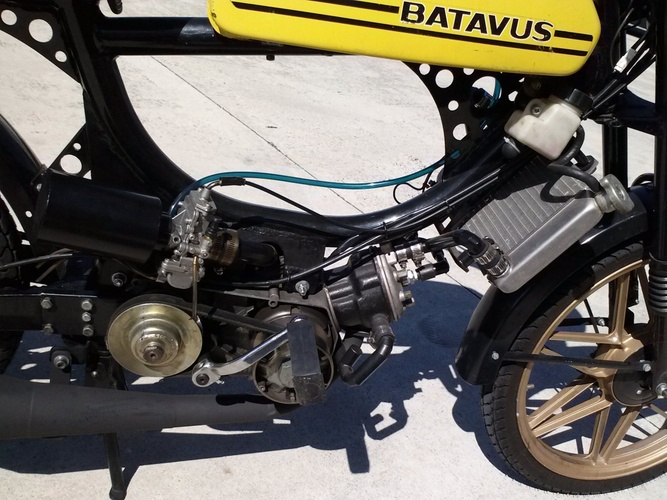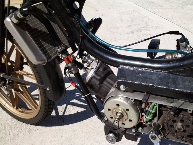 95cc (53mm) Liquid Cooled Derbi Pyramid Reed mated to a hacked up/modded up Free Spirit frame.