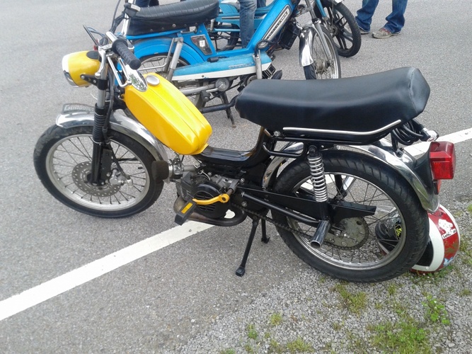 Paioli hydro forks, hydraulic disk brake up front, recovered Vespa Grande seat for maximum cush, Tomos rear shocks, bars are from a Yamaha RD200, 11:45 gearing for ripping off the line, powder-coated in black and school bus yellow with a ton of gold flake (with help from the Ghost Riders).