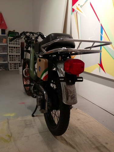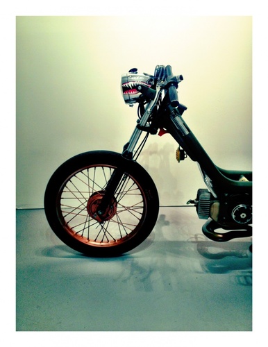 Started with a grande for fun and turned into a complete overhaul.. Although the Grande isn't the most desirable bike to do, I did what I could to make it tight..Custom painted matte army green, copper front wheel, rusted rear fender. Bike hits 50 mph and climbs hills with myself, girlfriend, and yorkie. Thanks to treats, sf moped, and friends with the same disease.. Best way to roll the "Wine Country"..