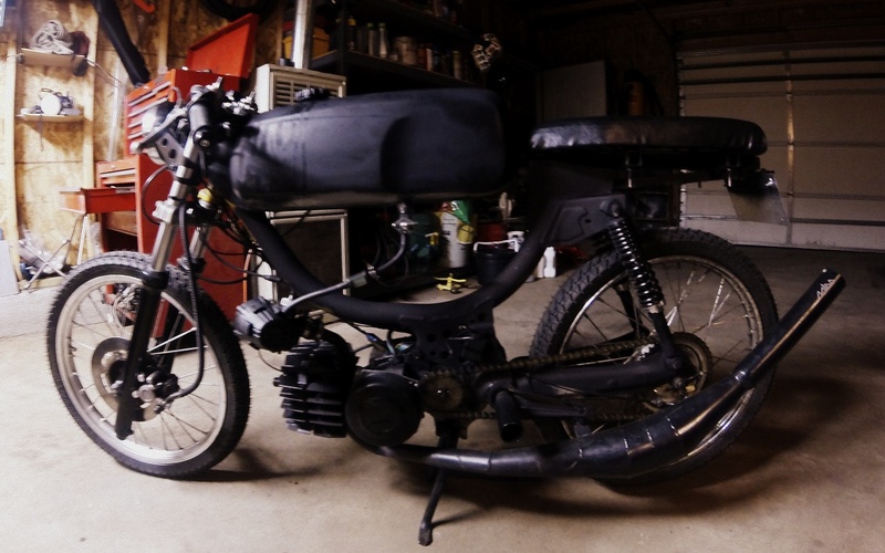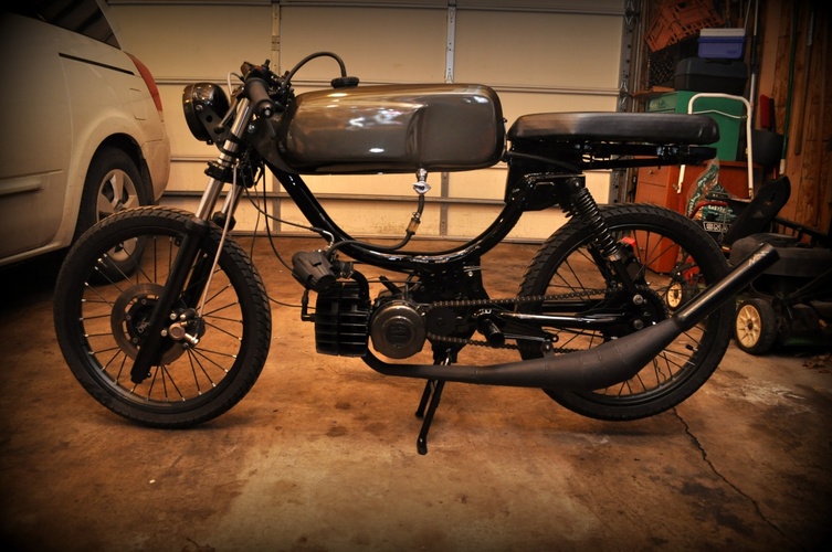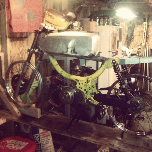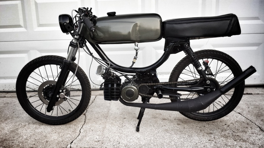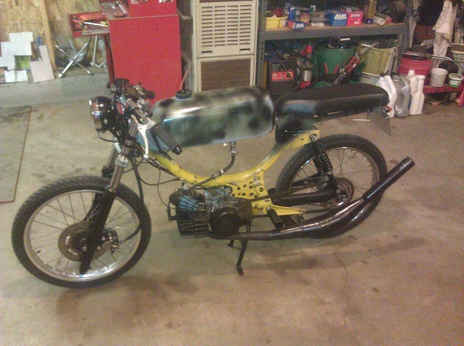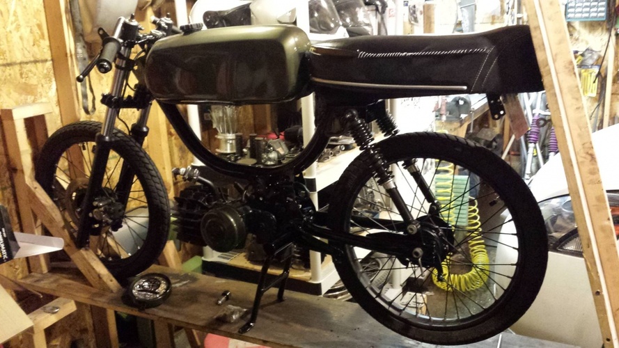 Kx80 Forks and front wheel, springs shortened about 4 inches. Tank is off a 1966 Montgomery Wards Riverside (benelli fireball). Seat is a reupholstered Tomos A3 seat. On the first gear clutch I'm running a 30lb red spring and on second gear I'm running a blue 20lb spring. Currently my gearing setup is 20 x 45 gonna go 37t on the rear shortly though.
