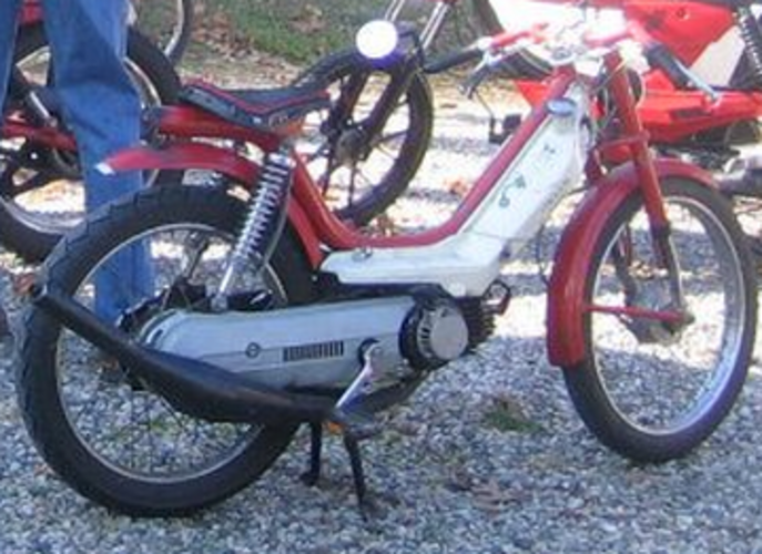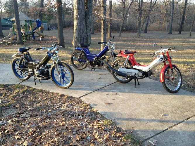 built to sprint from the back of the pack to the front when I'm blocking during group rides. this is my favorite bike. still using pa50II reed block with boysen 2 stage and a opened up 50II intake to an exhaust header for carb mounting.notched veriator with pa50I weights . indigan bars and a chopped and dropped puch seat pan with a crafting foam seat pad... bike does high 50'S all day long . top gps'd speed 63.9. the head stock has been turned to accommodate for the larger piston.