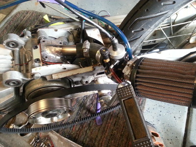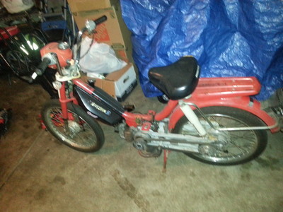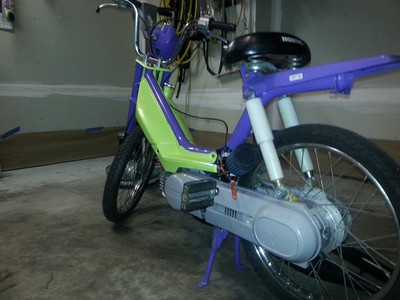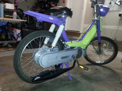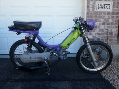 This was my second build and most challenging yet. Complete tear down, frame mod. to provide the side mount carb, custom 21mm intake, boring of the cases to allow the Derbi Metrakit to fit in the cases, TJT clutch, case matched, milled reed spacer to allow for the v-force reeds and motomatic rear pulley.