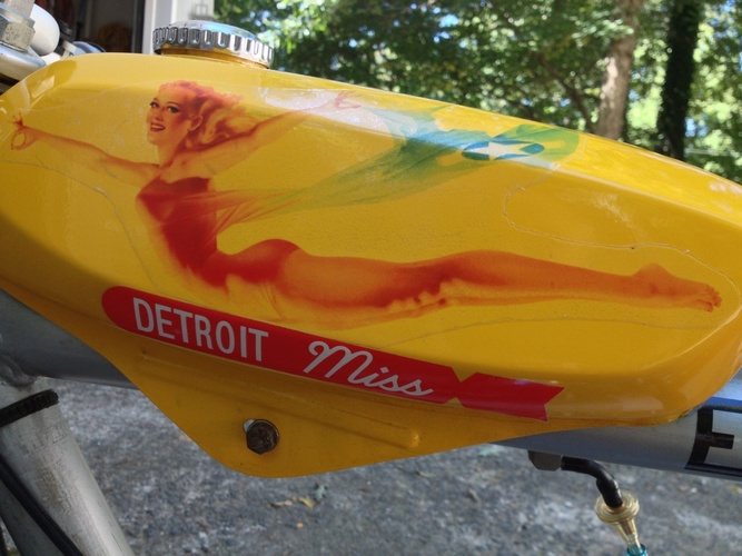 A 1978 Sears Free Spirit, 25 mph Silver Deluxe model modified into a cafe racer dedicated to the P-51D Mustang vintage fighter plane