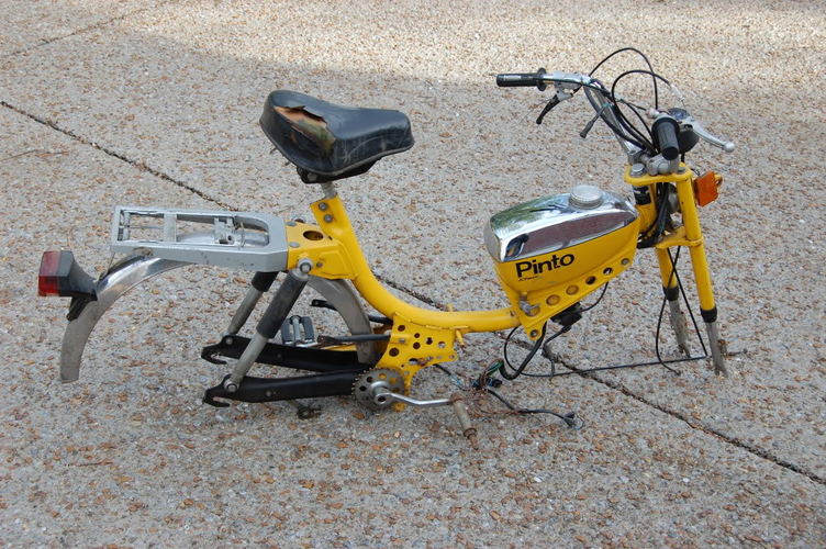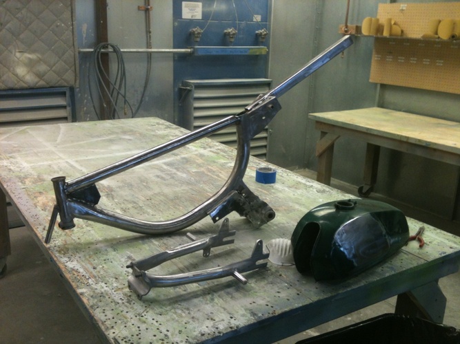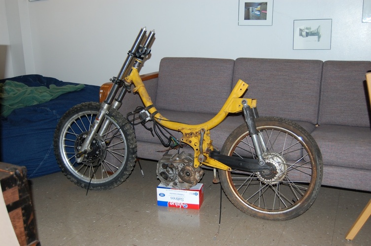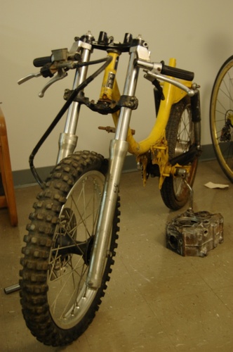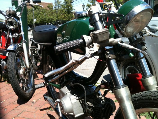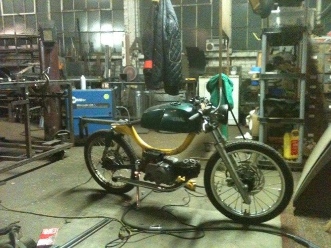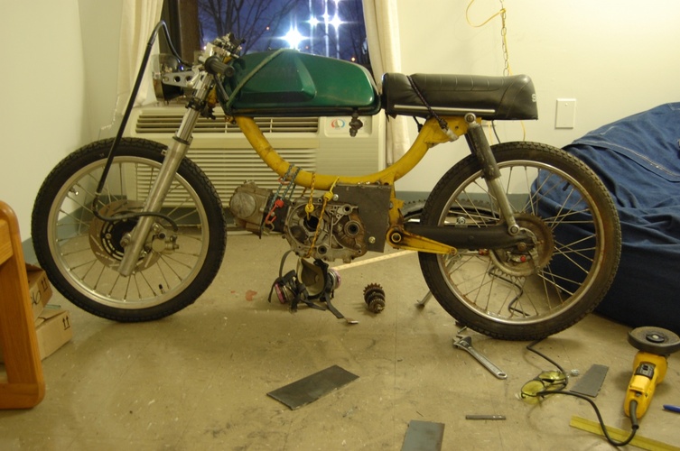 Built this bike inside on campus university housing... How I didn't get in trouble using an angle grinder in our room I have no idea. 100% vintage parts. Bike sports a 90cc CT70 motor from 1974 that I totally rebuilt - 4 speed ATC tranny, high performance roller bearing cam, race valve springs and vesrah performance clutch springs. 12vdc regulated/rectified electrical system with phone charging capability, LED and Halogen lighting built from treats parts. 1980 CR80 front end. Pinto was crusty (all suspension seized and motor completely F'd) motor came off of craigslist for $20 and was full of water when I got it. Winter 2013 it's going under the knife for a mechanical advance SL70 ignition, manual clutch, new transmission and some frame tweaks.