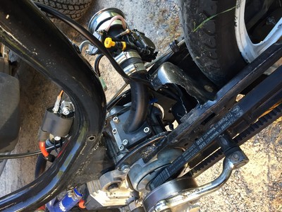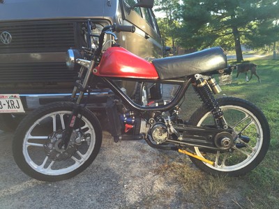 Custom front disk on hobbit mag. Malossi h2o. Polini water pump, early yz125 radiator, mmm rear pulley frame stretched 2 inches