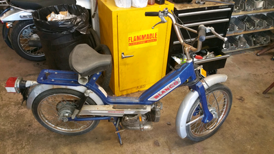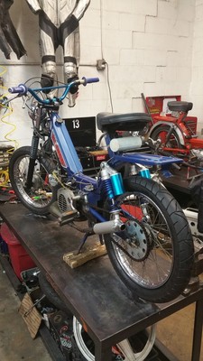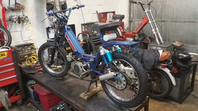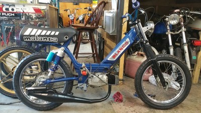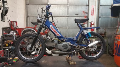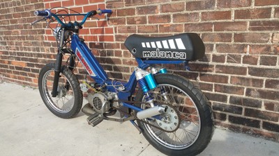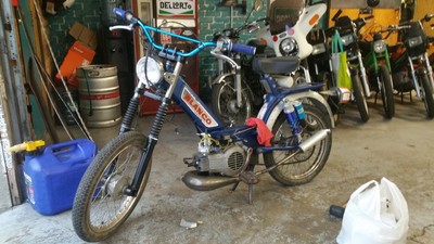 The bike would get Tomos Dirtbike forks like I have on my Bianchimatic, the BRN 76cc kit, an MLM intake, 18mm Mikuni, Treats' V1 Race Crank, new bearings, seals, gaskets, a machined head, sealed bearing conversion in the rear wheel, Pietcard CDI with a 2041 box, and a Tomos circuit pipe. The guys at Lucky Two Strokes did all that to get the bike running for the Uglies' rally. I really appreciate everything they did because it was all really last minute, and they were trying to make sure I had a bike to ride during the rally, that was way too cool. Since the rally, I've installed some hydraulic shocks, bars, mounted a pair of Heidenau tires. I've got a good bit of small stuff left until it is "done", but it's ridable now. I've got all the fenders and sidecovers off of it, I am going to strip and airbrush them this week. I'm also waiting on a Tomos BK100 pipe, a front sprocket, and a fender to come in the mail from Treats. I'll post some more pics as I take them and what not.