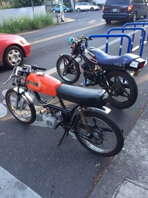 Bought this bike totally stock, totally crappy for 50 bucks. Put a bunch of money into it and now it's fast. Cut a bunch of junk off the frame because it looked dumb. Cut the fenders, made new rear fender mounts, made the front fork stabilizer/fender mount, repadded the stock seat, welded up a mount for an LED taillight under the seat, intake made out of stock exhaust, 11x44 gearing, probably some other stuff I'm forgetting. It's got just the right amount of crust, daily blaster and currently my only mode of transportation.